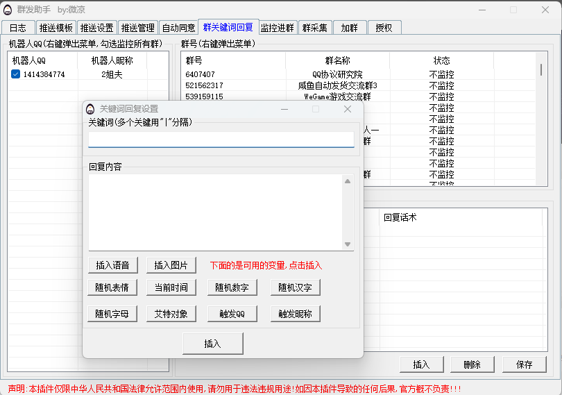 软件具备群关键词回复功能,用户可以设置自动回复规则,根据群组中的关键词进行自动回复。这一功能有助于企业快速响应客户需求,提升服务质量。