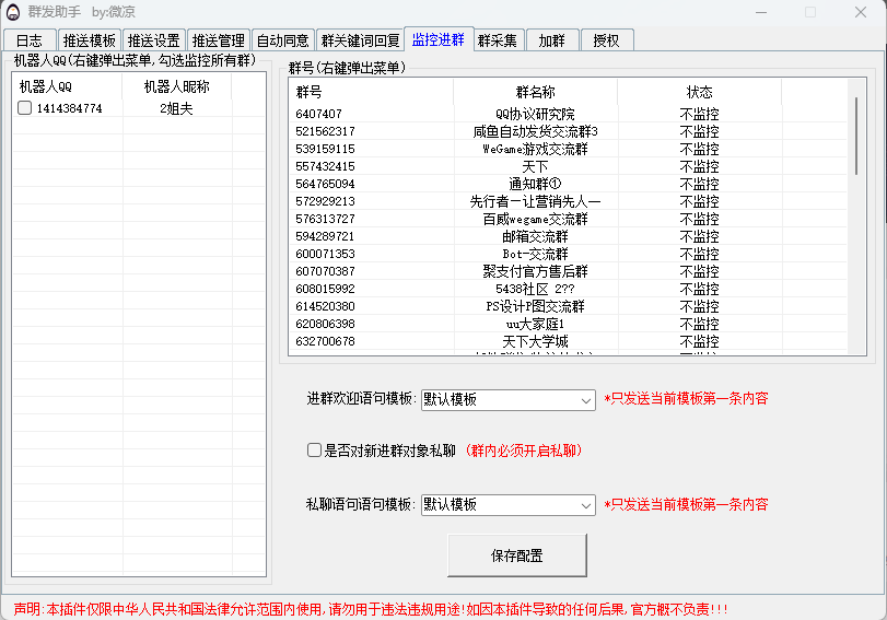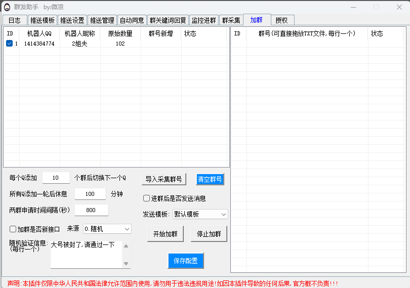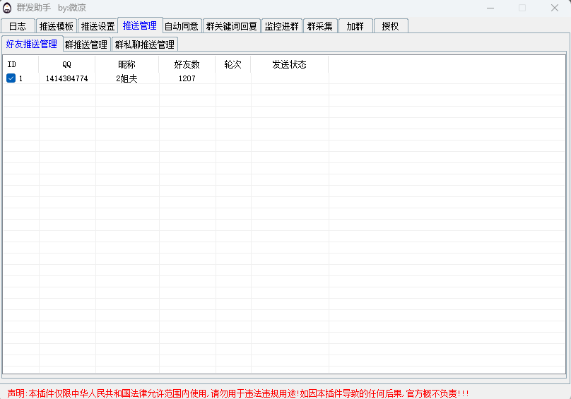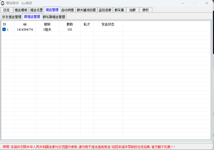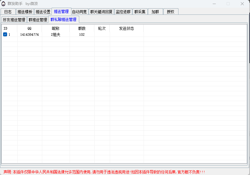 微凉QQ群营销软件具备群发群消息功能,用户可以向多个群组同时发送消息。这一功能适用于需要在多个群组中进行推广的用户,极大地提高了操作效率。