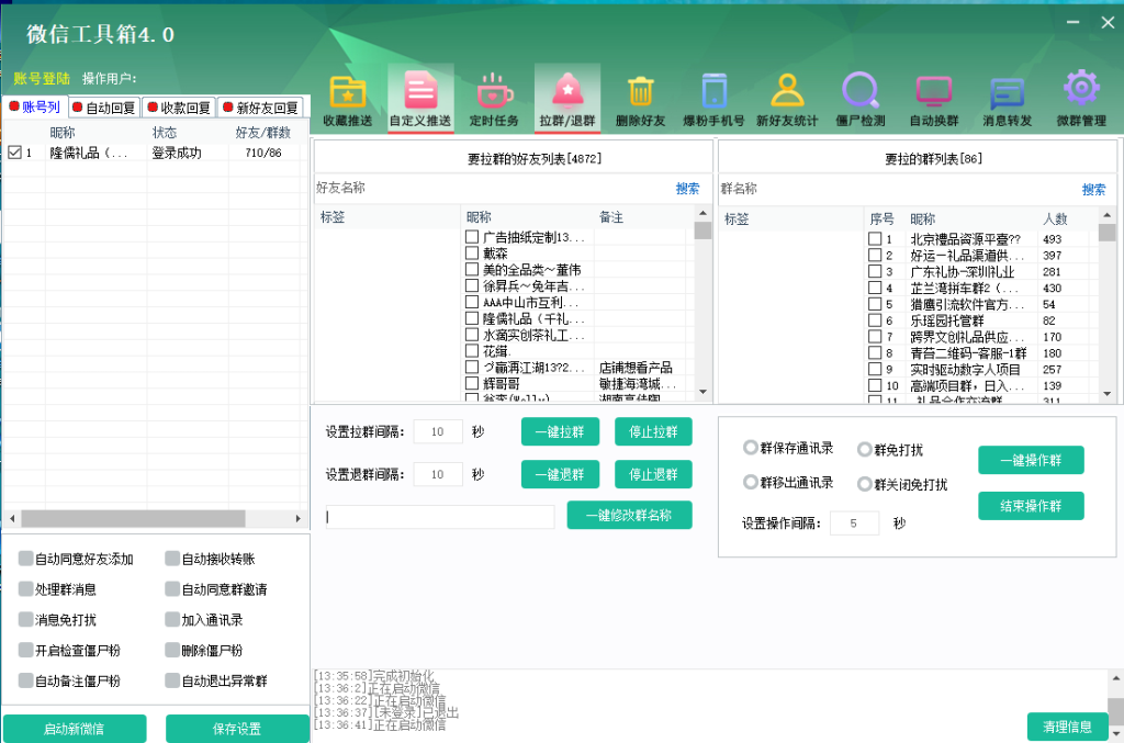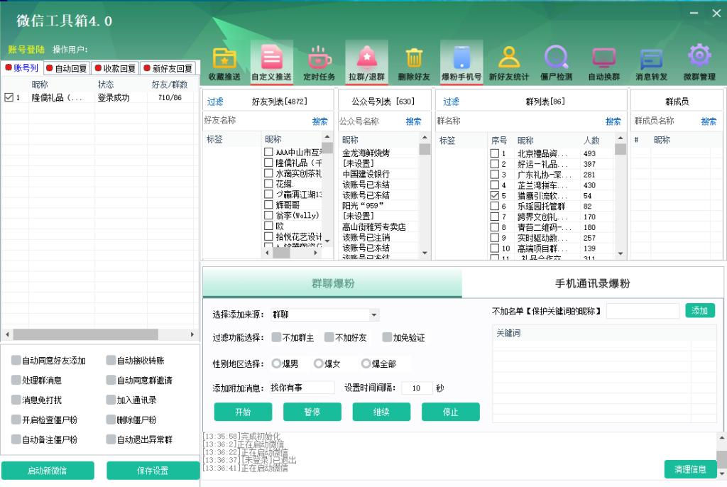 微信工具箱4.0.1的群发消息和群发好友功能,能够帮助用户快速发布信息到多个群聊或好友,极大提升了信息发布的效率和覆盖面。无论是发送促销信息,还是发布新品公告,这些功能都能让您轻松应对。