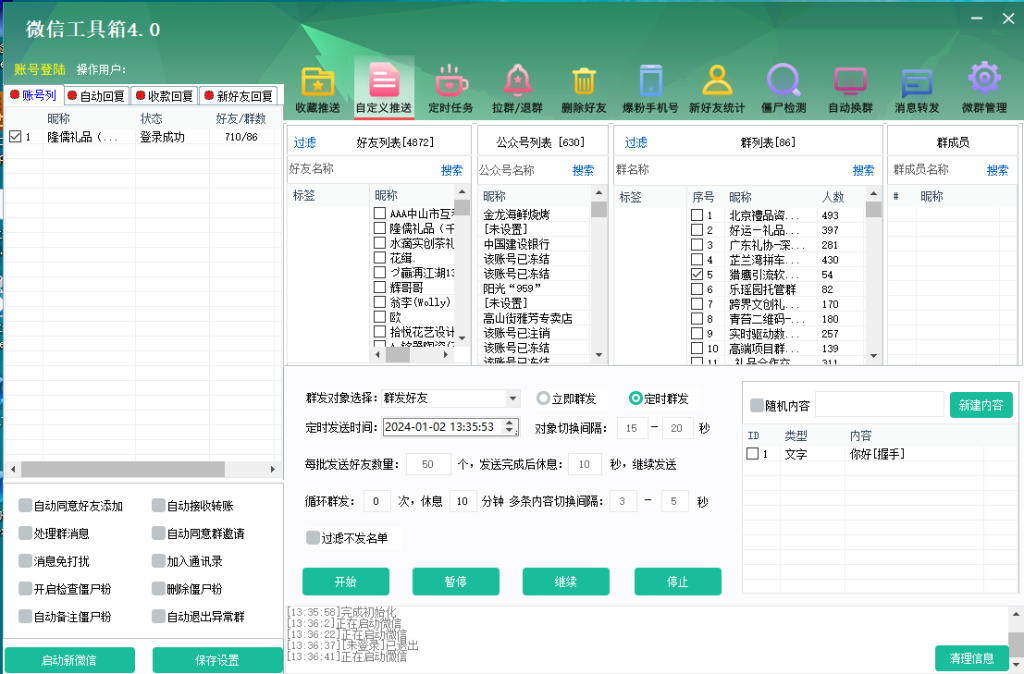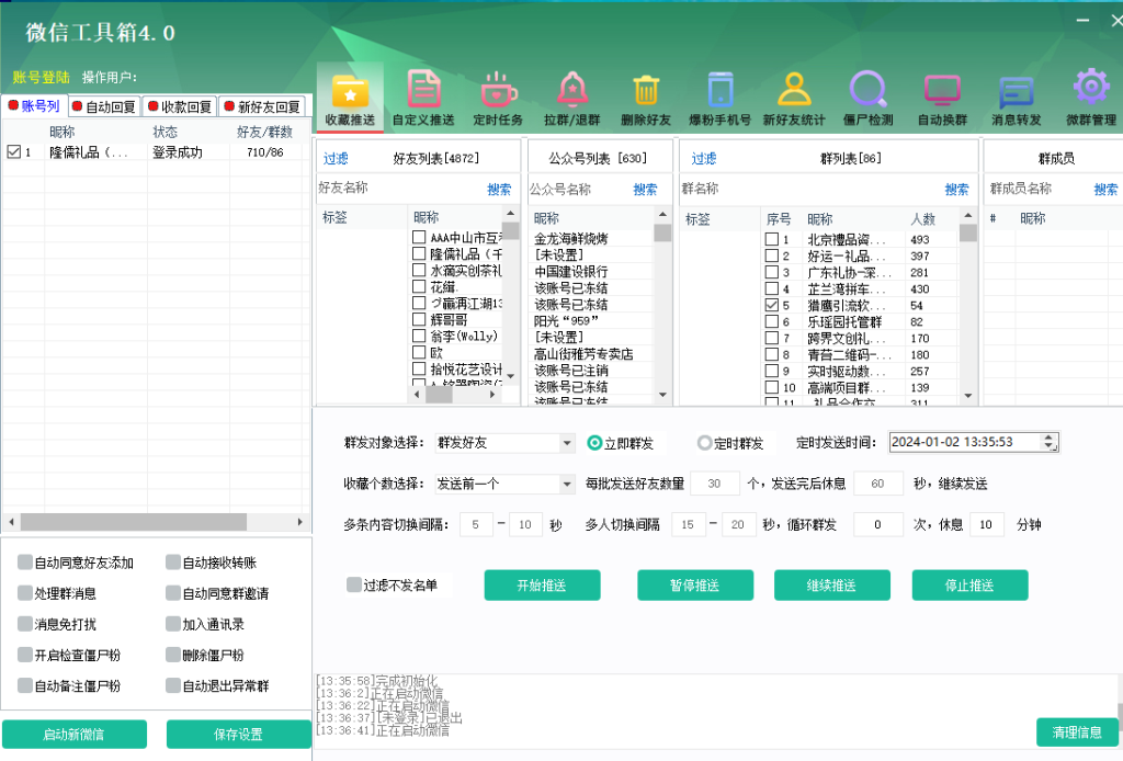 微信工具箱4.0.1的消息群发功能,支持多个账号的同时群发消息,极大提升了信息发布的效率。无论是发送促销信息,还是发布新品公告,消息群发功能都能让您轻松管理多个账号,确保信息的及时传达。