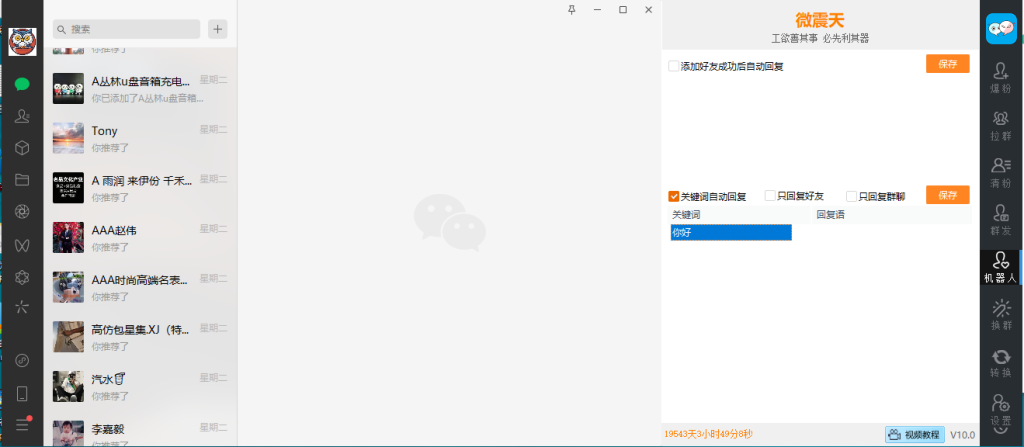 微震天微信群发加人爆粉10.0的机器人功能,能够新好友自动回复、备注、自动收款等。通过这一功能,用户可以轻松管理好友,提升营销效率。