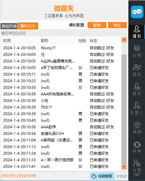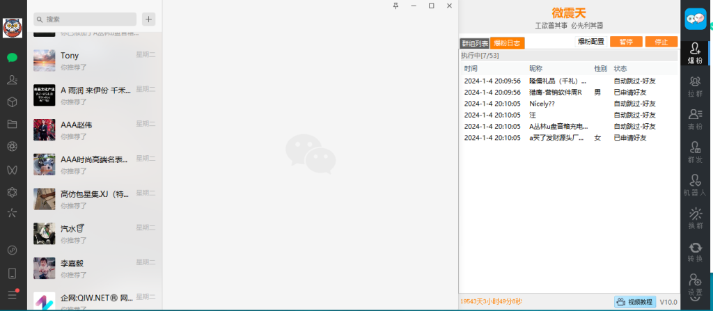 微震天微信群发加人爆粉10.0的群爆粉功能,能够一键勾选群,过滤群主、性别添加群成员。通过这一功能,用户可以轻松管理微信群成员,确保群聊的活跃度和互动性。