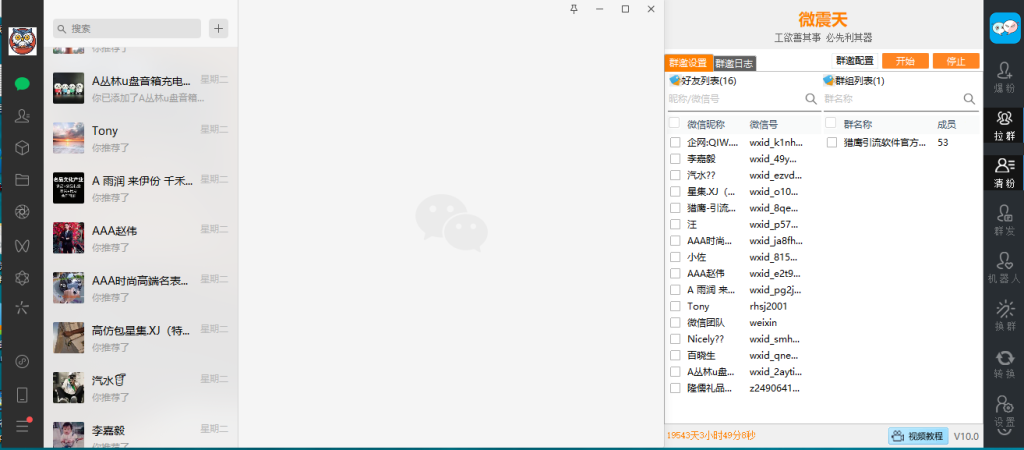 微震天微信群发加人爆粉10.0的拉群功能,能够轻松邀请好友进群,协助换群。通过这一功能,用户可以轻松管理微信群成员,确保群聊的活跃度和互动性。
