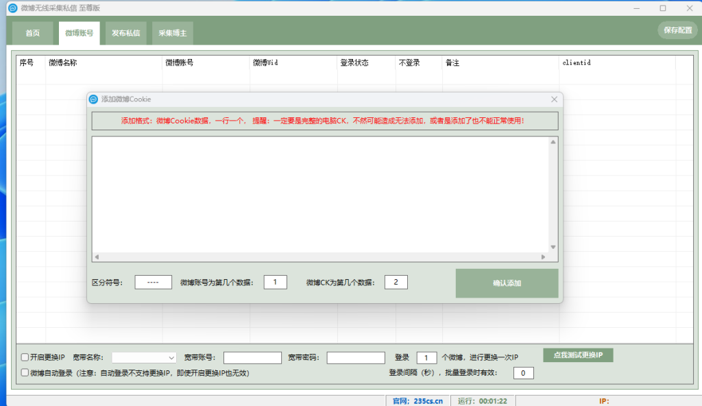 微博无限采集私信营销工具支持批量登录功能,允许用户同时管理多个微博账号。这对于拥有多个品牌或需要分不同时间段进行推广的营销团队来说尤为重要。通过批量登录,用户可以节省大量的时间和精力,集中进行营销活动。