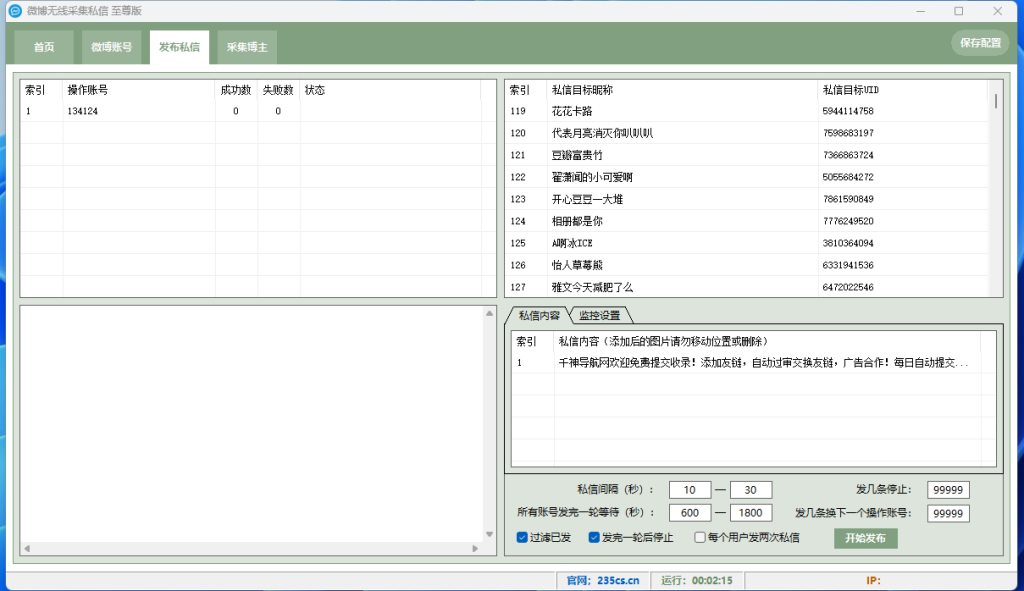 私信是与粉丝和用户进行直接互动的重要方式。微博无限采集私信营销工具的自动私信功能,允许用户批量发送私信,进行个性化的沟通和推广。通过自动私信,用户可以快速回应粉丝的询问,提供产品信息或进行促销活动,增强用户粘性和满意度。