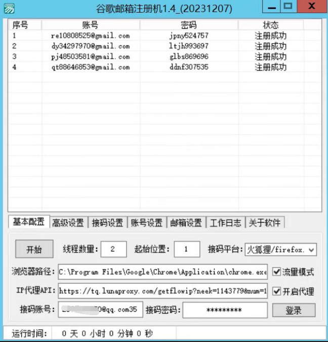 谷歌邮箱注册机是一款全自动话批量注册谷歌邮箱号的软件,软件需要海外环境,海外动态IP 和火狐狸接码平台,支持多线程操作,支持指纹模式,支持添加转发邮箱,支持添加辅助邮箱,开通POP,开通IMAP,开通两步验证,支持注册各国邮箱,支持随机账号密码,账号长度,支持指定账号密码,账号长度,支持无痕模式。