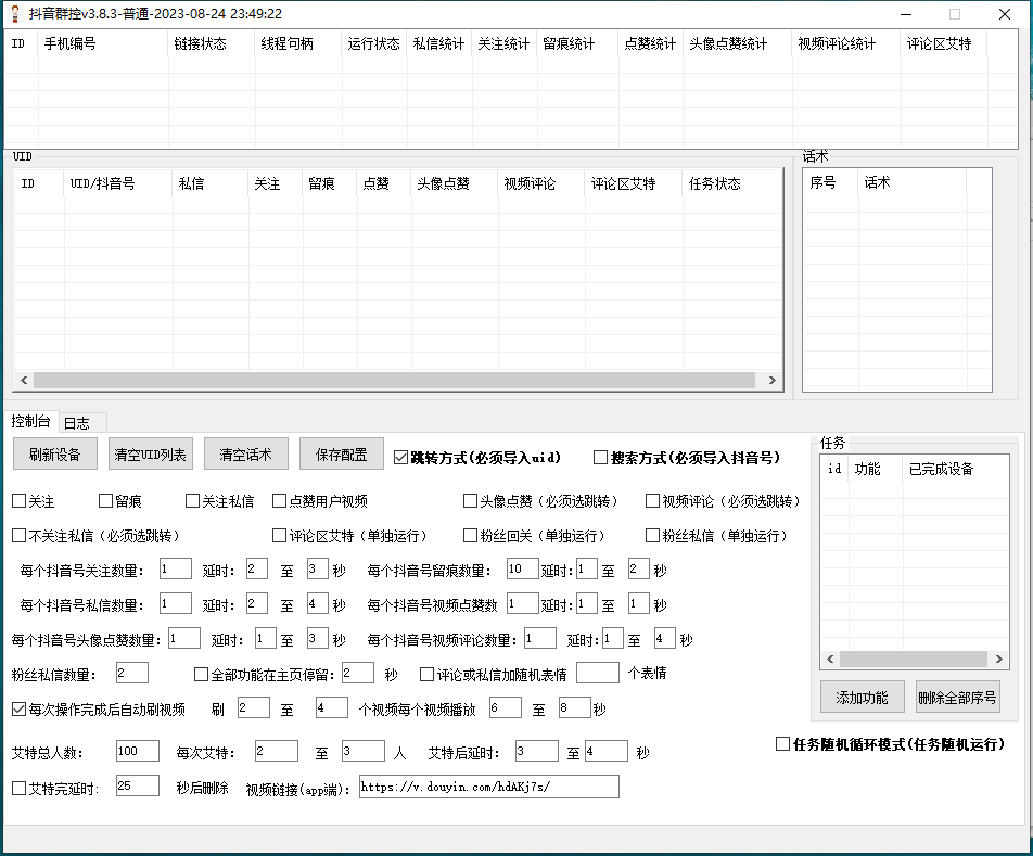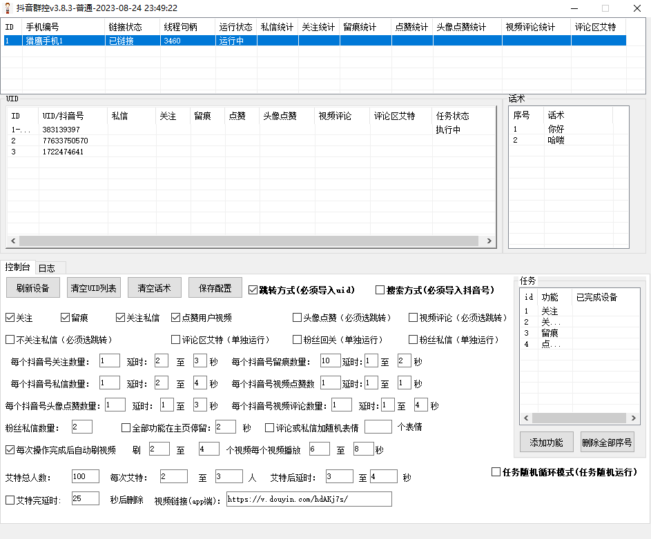 批量控制几十台手机,操作手机上的抖音账号进行以下操作