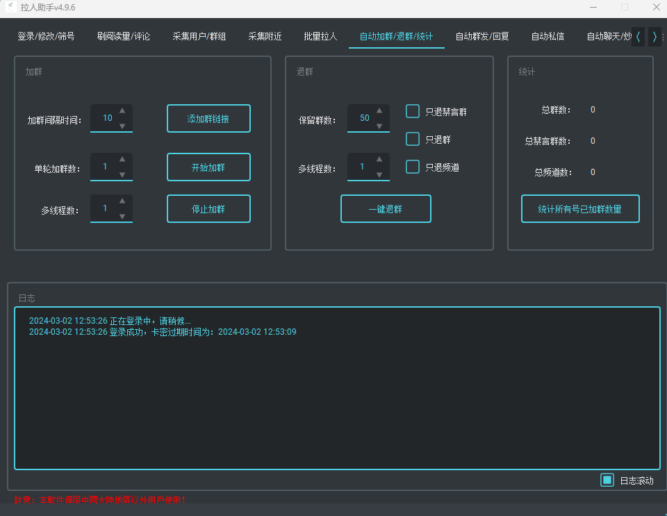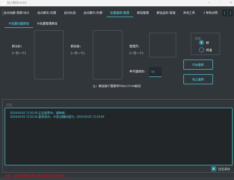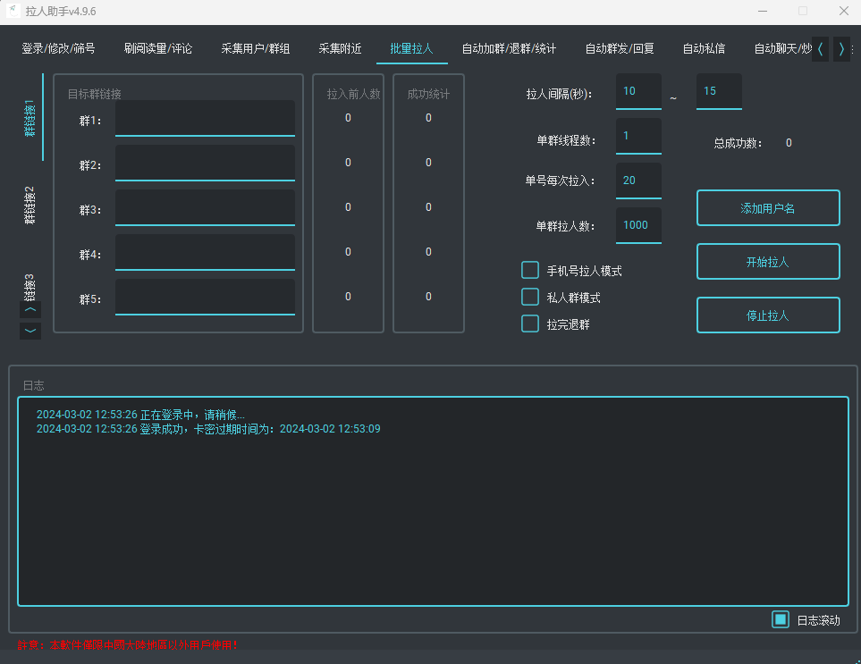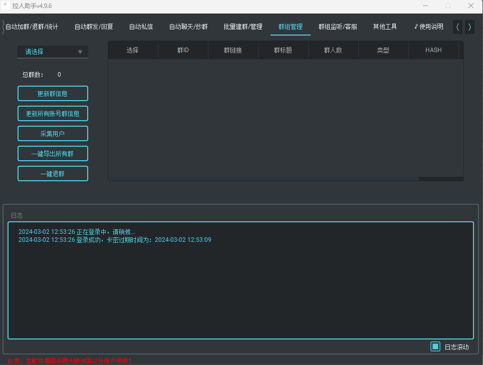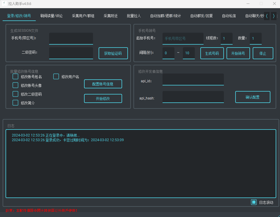 主要功能;群组管理,自动加群,自动群发,自动私信,加群退群统计,自动回复,自动聊天,自动炒群,批量建群,群组监听,批量拉人,关键词采集,采集附近人,自动评论,刷阅读量,批量登陆