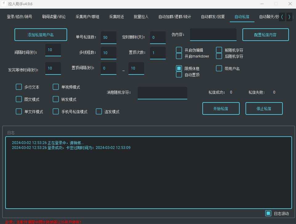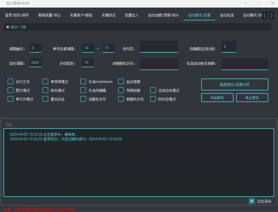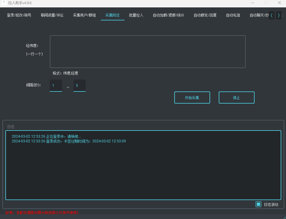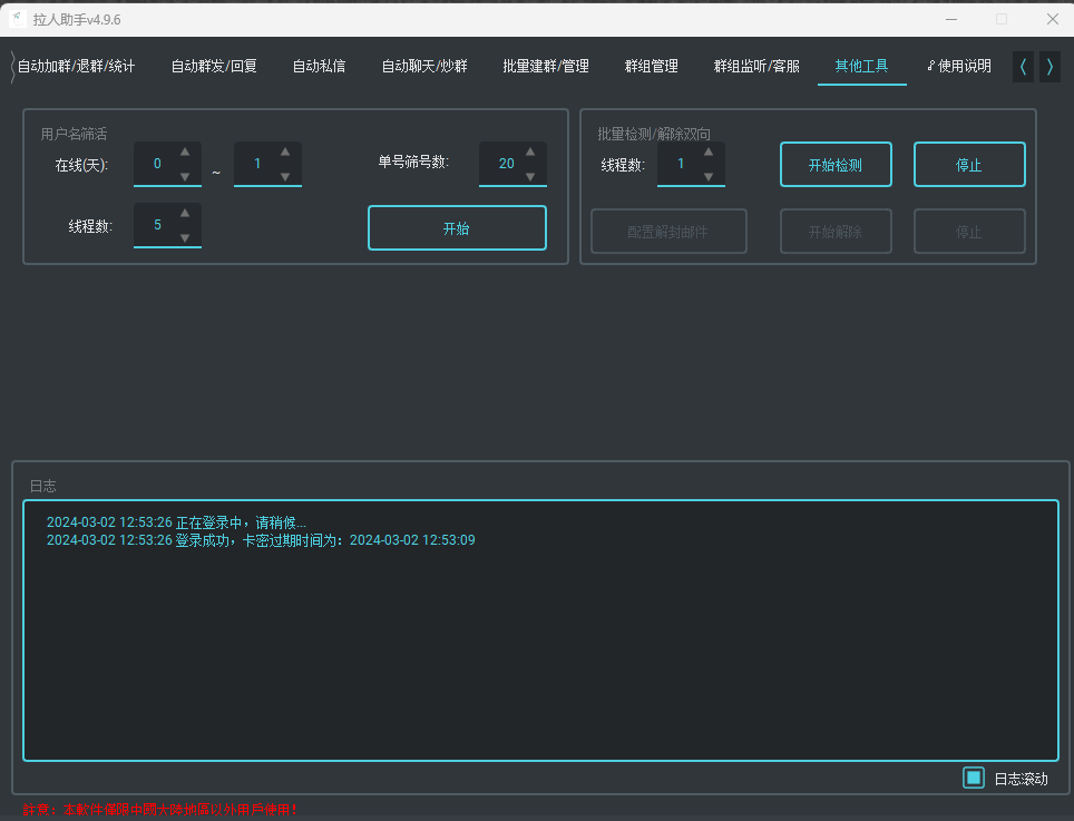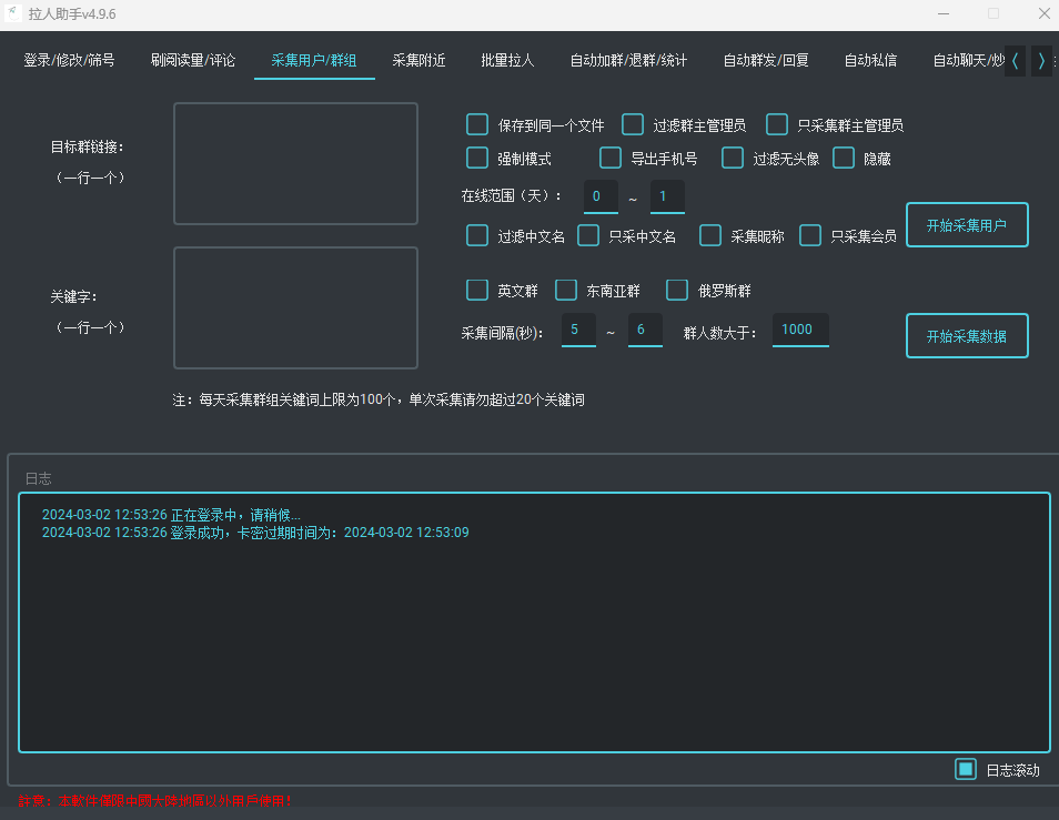 主要功能;群组管理,自动加群,自动群发,自动私信,加群退群统计,自动回复,自动聊天,自动炒群,批量建群,群组监听,批量拉人,关键词采集,采集附近人,自动评论,刷阅读量,批量登陆