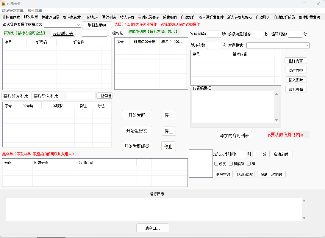 群发消息、群发好友和群发群成员:支持批量发送消息给群成员和好友,便于进行大范围的信息传播和营销推广。