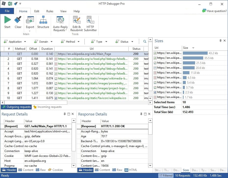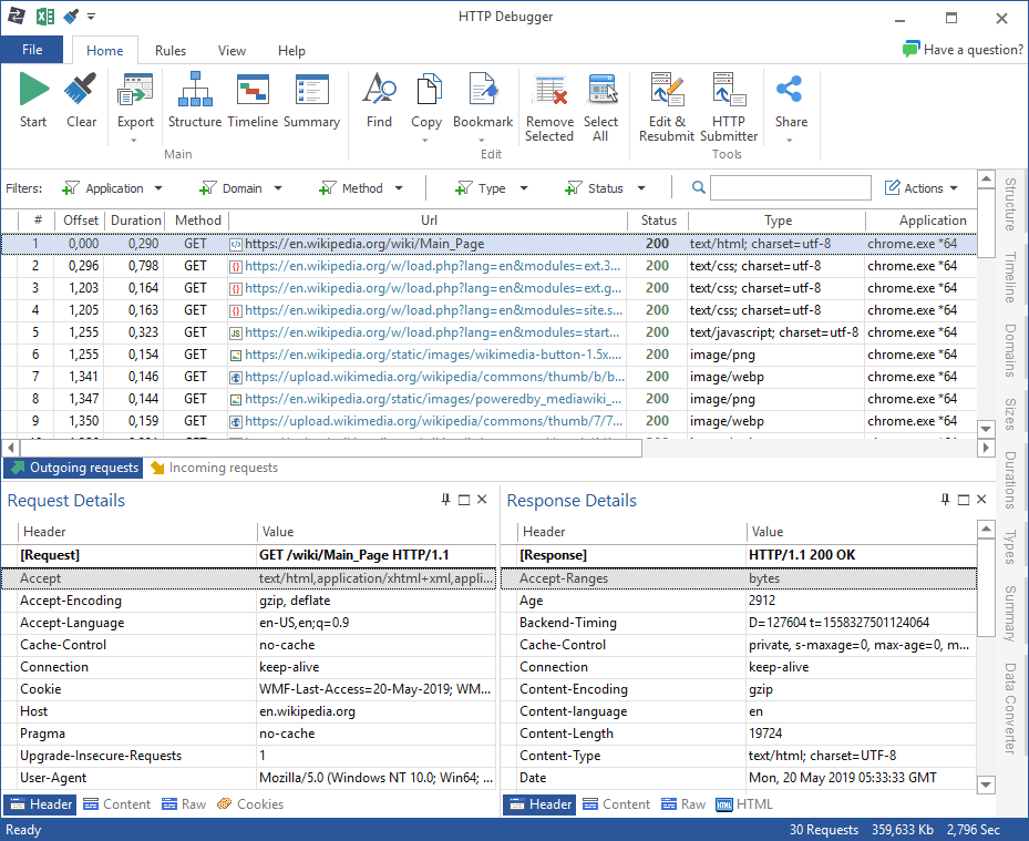 - 可视化数据分析:以图表的形式展示流量,帮助查找最慢和最大的请求、请求最多的域和内容类型。