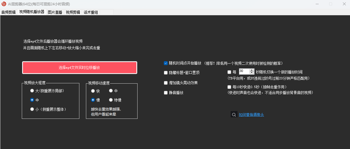 AI音视频混剪器内置了视频随机播放器,可以帮助用户随机播放视频文件,增加观看乐趣和创意灵感。