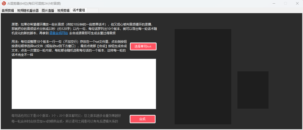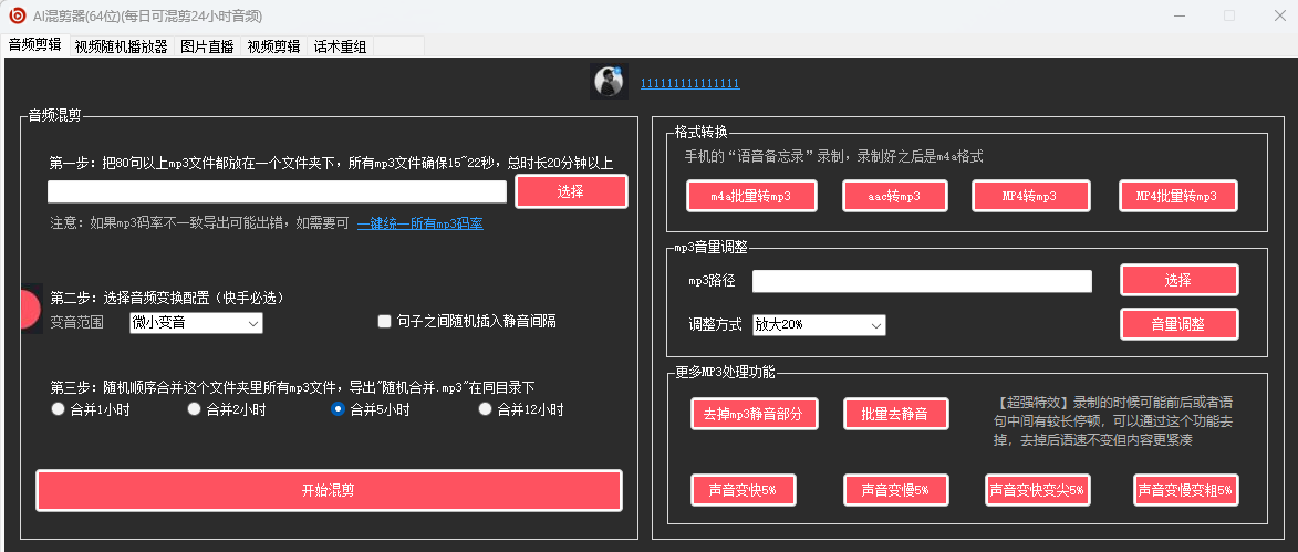 AI音视频混剪器是一款多功能的创作工具,涵盖了音频混剪、视频混剪、图片混剪、图片直播、视频随机播放、话术重组和自动消重等多种功能